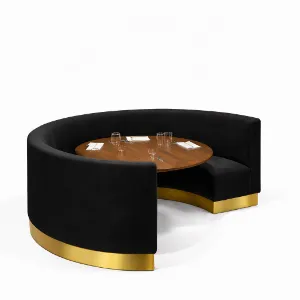 Siyah Yuvarlak Booth Loca Koltuk, modern ve lüks mekan konseptleri için tasarlanmış, güçlü duruşu ve zarif detaylarıyla öne çıkan özel bir oturma grubudur. Siyah döşeme yüzeyi mekâna sofistike bir atmosfer kazandırırken, alt kısımdaki metalik detaylar tasarımı üst segmente taşır.