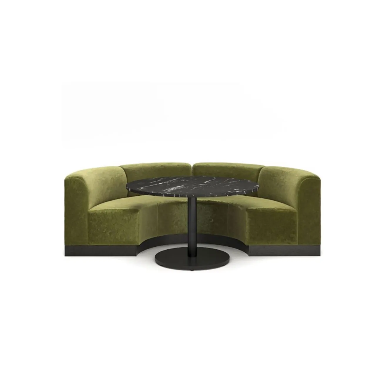 Yuvarlak Kadife Loca Koltuğu, cafe ve restoranlar için şık, konforlu ve sosyal oturum alanları oluşturmak amacıyla tasarlanmıştır. Yarım daire formu sayesinde kullanıcıları merkeze yönlendirir ve masa etrafında dengeli bir oturum düzeni sunar. Orta konumda yer alan masa, servis kolaylığı sağlayarak işletmeler için fonksiyonel bir kullanım avantajı oluşturur.